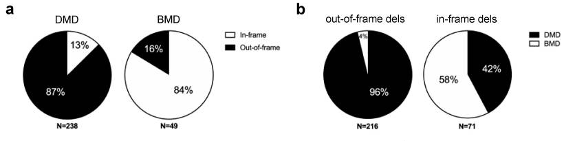 90%的变异与表型的关系可以遵循开放阅读框规律,即大多数框外突变导致DMD,而大多数框内突变导致BMD。对此,加拿大神经肌肉研究也针对DMD和BMD患者的框内和框外缺失的频率进行了统计,发现238名拥有缺失型变异的DMD患者中,87%为框外变异;13%为框内变异;在49名拥有缺失变异的BMD患者中,84%为框内变异,16%为框外变异(a)。从所有缺失型的变异角度来说,96%(208/216)的框外缺失表现为DMD患者,只有4%(8/216)表现为BMD患者。重复变异也表现为类似的规律。