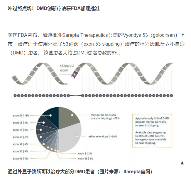 2016年9月美国食品和药物管理局(FDA)有条件批准Sarepta治疗公司的新药Exondys 51,成为首个获批治疗杜氏肌营养不良症(DMD)的药物。FDA表示,Sarepta提交的数据证实该类DMD患者(抗肌营养不良蛋白基因中存在可导致51号外显子跳跃的确证突变))经Exondys 51治疗后抗肌营养不良蛋白(dystrophin)水平升高,而这可以合理的预测这些DMD患者中的临床受益。今年,FDA宣布加速批准Sarepta治疗公司Vyondys 53上市。