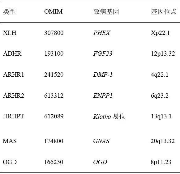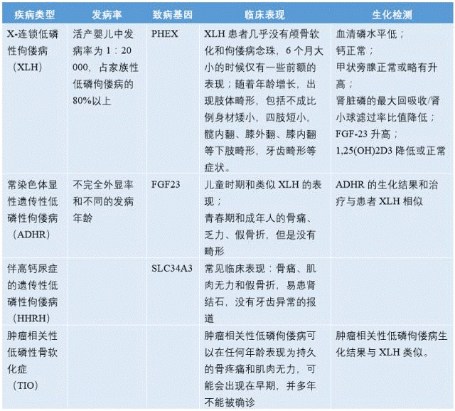 低磷性佝偻病主要包括以下几种类型:X-连锁低磷性佝偻病(XLH);常染色体显性遗传性低磷性佝偻病(ADHR)、常染色体隐性遗传性低磷性佝偻病(ARRH)、伴高钙尿症的遗传性低磷性佝偻病(HHRH)和肿瘤相关性低磷性骨软化症( TIO)等。