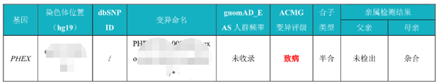 检测结果:在受检者 PHEX 基因上检测到 1 个半合无义变异,测序结果显示受检者该变异遗传自母亲,受检者父亲未检出该变异。PHEX 基因异常导致 X 连锁显性遗传的低磷性佝偻病(OMIM#307800)。