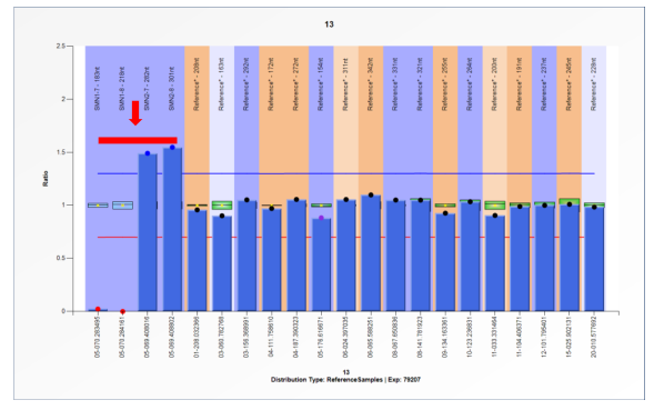 检测结果:提示受检者SMNI基因7-8号外显子纯合缺失,SMN2基因7-8号外显子重复,可导致脊髓型肌肉萎缩症。