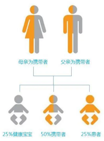 脊髓性肌肉萎缩症(SMA)是常染色体隐性遗传病,当那些看起来正常但基因并不完美的爸爸和妈妈,同时携带SMA基因缺陷时,孩子有25%概率是SMA患者,50%概率是SMA携带者,25%概率是正常人;若父母一方是携带者,孩子50%概率是携带者,50%概率是正常人。